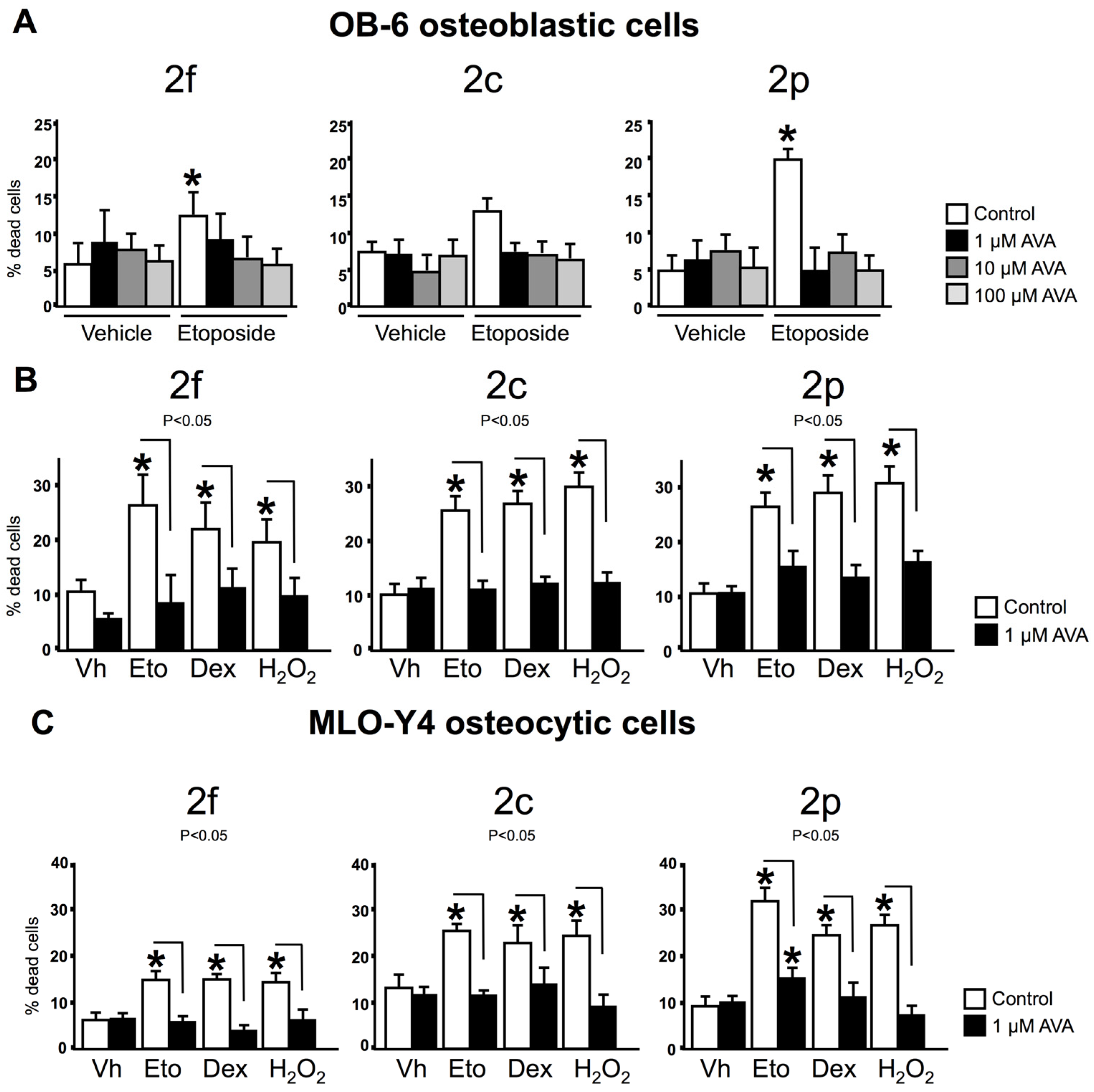 AVAs do not induce apoptosis and prevent cell death induced by proapototic agents in osteoblastic and osteocytic cells. (A) Cell death was examined in osteoblastic cells pretreated for 1-h with vehicle (control) or 3 different doses of AVA 2f, 2c and 2p, followed by exposure to vehicle (Vh, dimethylsulfoxide (DMSO)) or etoposide for 6-h; (B,C) Cells were treated with vehicle (control) or 1 μM AVAs for 1 h, followed by 6 h-treatment with the indicated compounds. Vh, vehicle; Eto, etoposide; Dex, dexamethasone or H2O2. Cell death was assessed by trypan blue uptake. Bars represent the means ± SD of n = 6 independent wells/treatment. * p < 0.05 vs. Vh control, and lines connect conditions with significant differences by One-Way ANOVA, followed by Tukey method.
