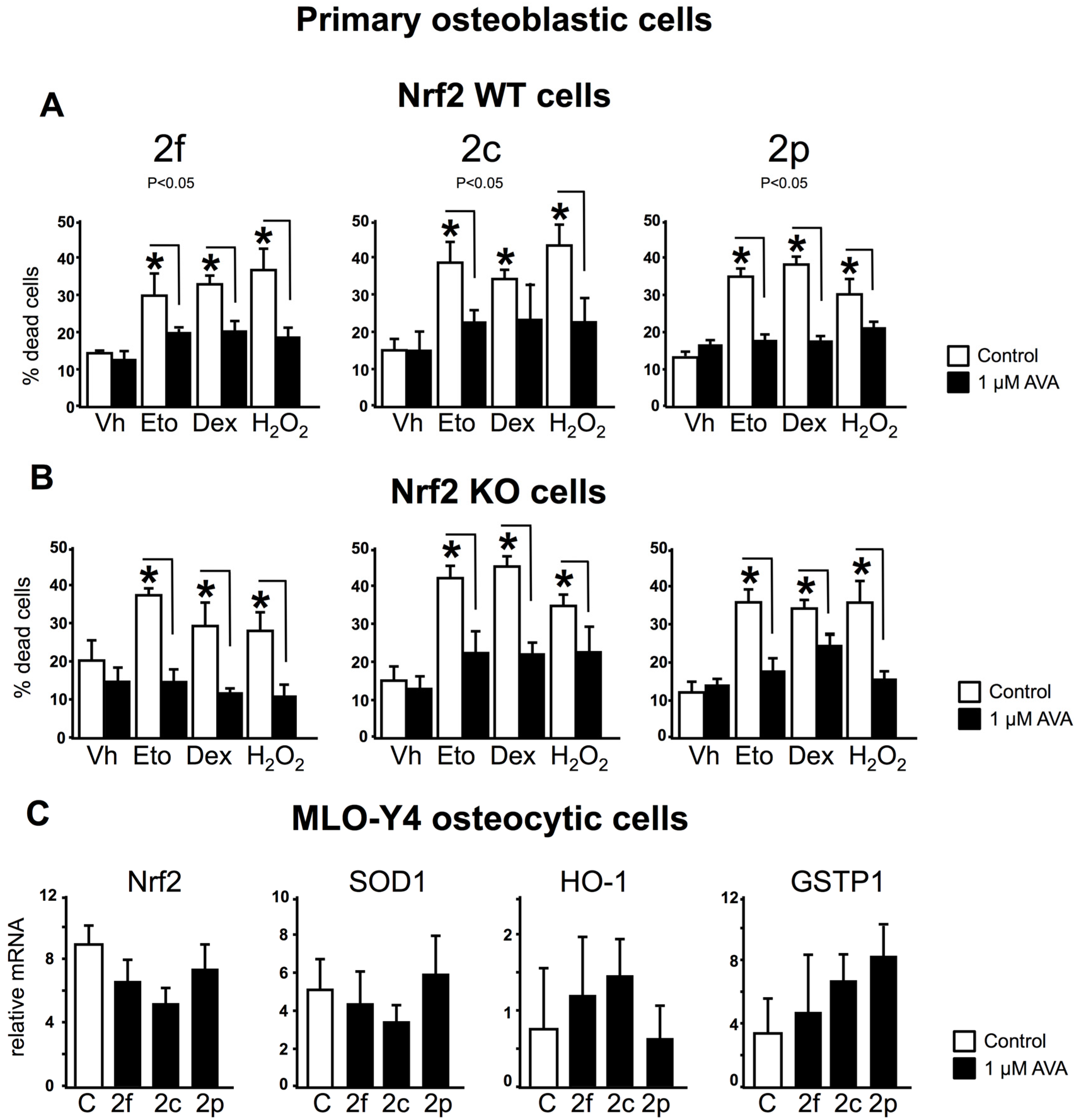 We examined whether activation of the Nrf2 pathway, a key component of the antioxidant cellular defense mechanism, was involved in the protective effects of AVAs on osteoblastic cells, by comparing the effects of AVAs in WT or Nrf2 KO osteoblastic cells. Pre-treatment with AVA 2f, 2c or 2p prevented cell death induced by etoposide, dexamethasone or H2O2 in WT primary osteoblastic cells (Figure 3A). Surprisingly, AVAs were also effective in promoting survival in primary KO osteoblastic cells (Figure 3B). Moreover, AVA 2f was more effective to decrease cell death in the absence or in the presence of pro-apoptotic agents, in primary KO osteoblastic cells compared to WT cells. These findings demonstrate that the survival effect of AVAs on osteoblastic cells does not require Nrf2 expression. Consistent with this conclusion, the mRNA expression of the Nrf2 target genes, cytoprotective enzymes SOD1, HO-1 or GSTP1 were not affected by treatment with AVAs in MLO-Y4 osteocytic cells (Figure 3C).
