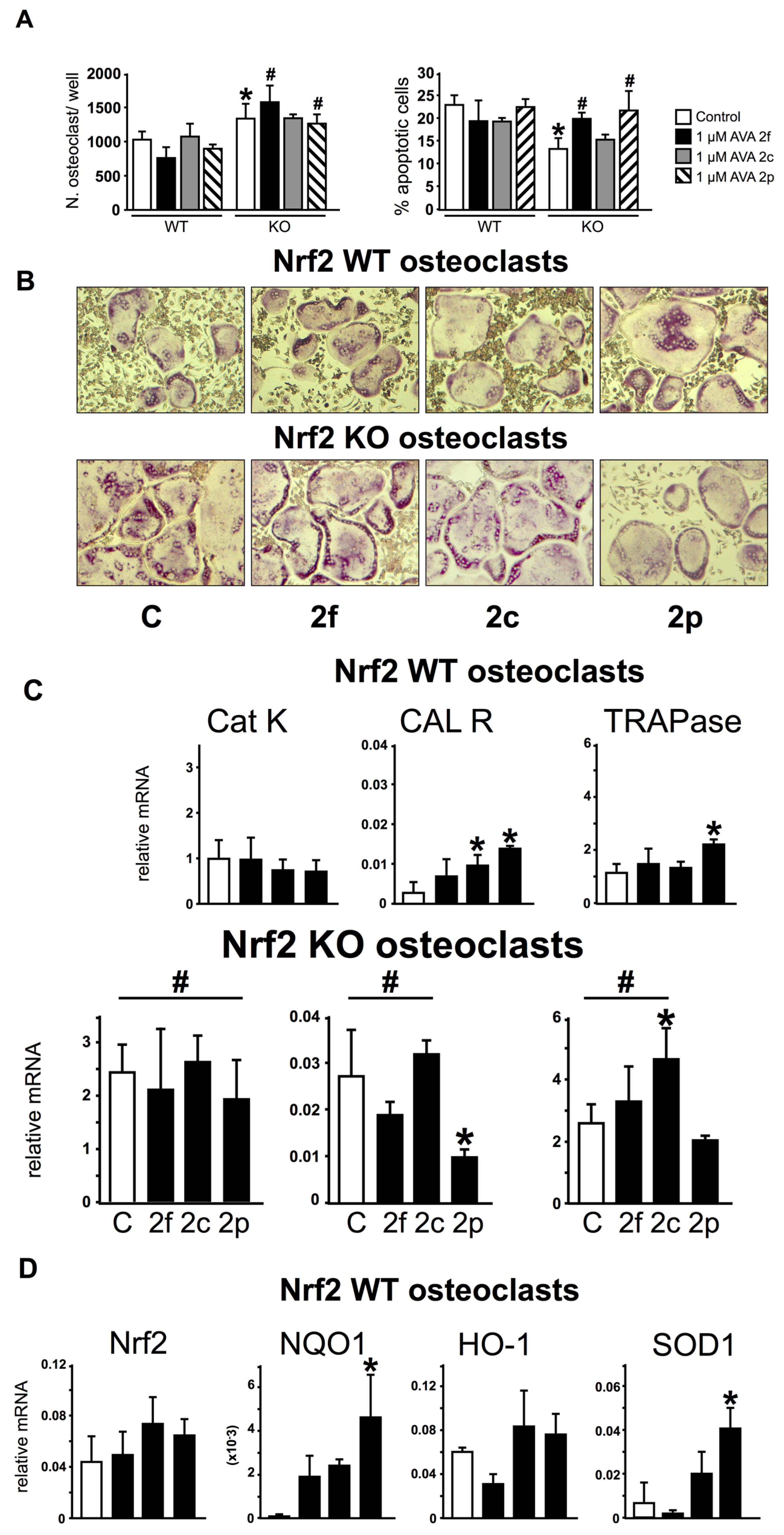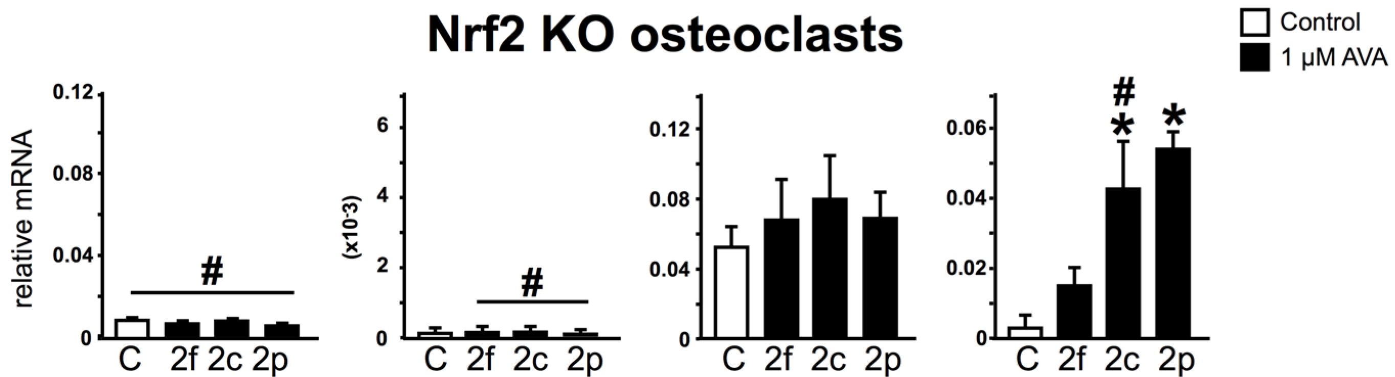 We next examined the effect of AVAs on osteoclasts and the potential requirement of Nrf2. Bone marrow osteoclast precursors lacking Nrf2 (KO cultures) treated with vehicle (control) produced 30% ± 2% more osteoclasts than WT control cultures (Figure 4A,B). In addition, KO control cultures exhibited lower number of apoptotic osteoclasts compared to WT control cultures (13% ± 2% vs. 23% ± 2% for KO and WT, respectively). Although AVAs did not affect the number or the percentage of dead osteoclasts in WT cultures (Figure 4A,B), AVAs 2f and 2p increased the percentage of apoptotic osteoclasts in KO cultures to reach levels found in WT cultures. Consistent with the increased osteoclast number observed in KO cultures, the expression of genes that characterize mature osteoclasts, including Cat K, CAL R and TRAPase, were higher in these preparations compared to WT cultures (Figure 4C). AVA 2f did not affect osteoclastic gene expression either in WT control or KO cultures. AVA 2c increased CAL R expression in WT cultures. Further, AVA 2p increased the expression of CAL R and TRAPase in WT cultures, whereas it decreased CAL R in KO cultures. This latter effect is consistent with the pro-apoptotic effect of AVA 2p on KO cultures (Figure 4A).