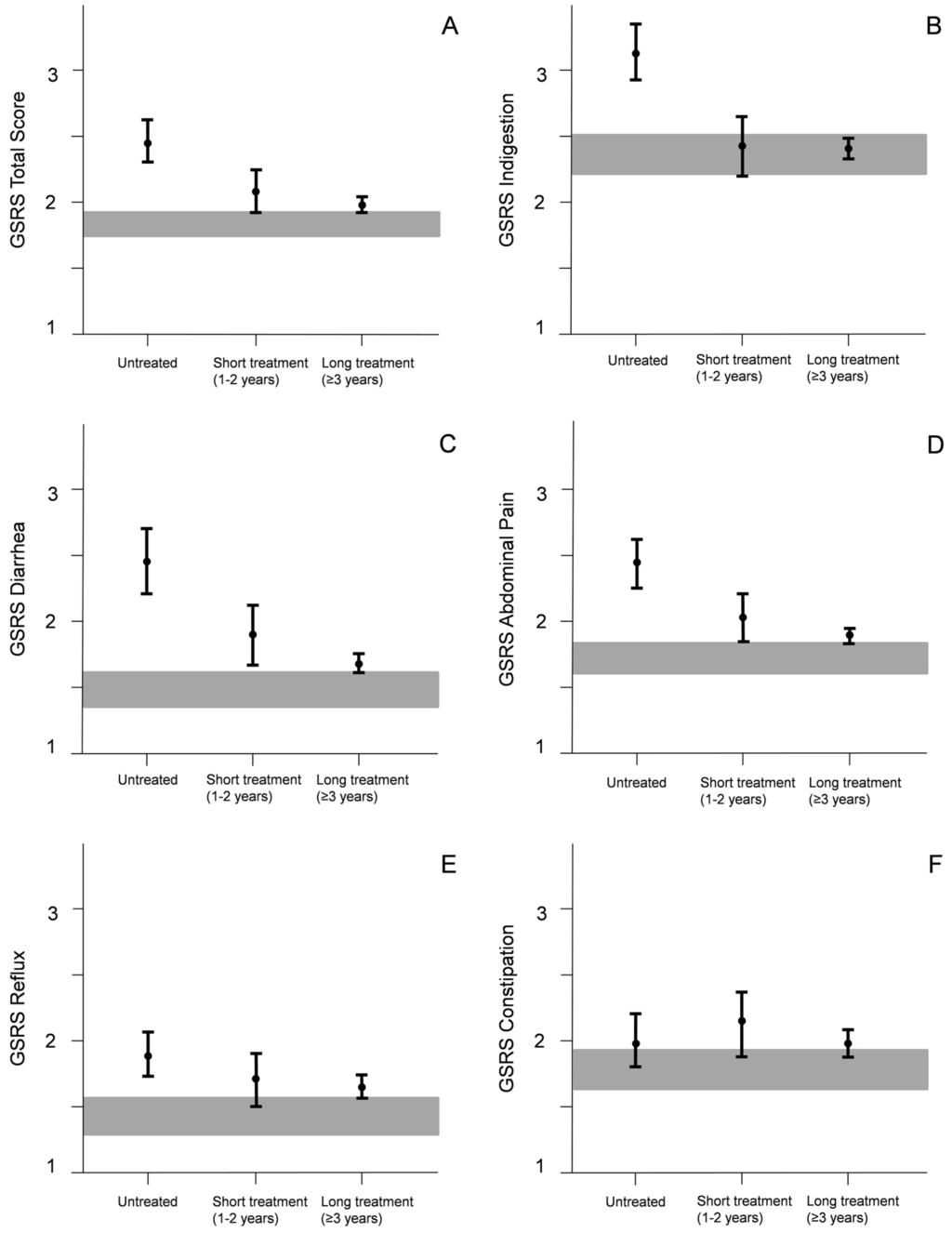 Gastrointestinal Symptom Rating Scale (GSRS) total (A) and sub-dimension (B–F) scores in untreated, short-term treated and long-term treated patients compared with healthy controls. Values are expressed as means with 95% confidence intervals (CI) and gray bars denote 95% CIs of controls. There were significant differences between the groups as follows: (A) Untreated patients and all other groups (p < 0.001), and short-term treated patients and healthy controls (p = 0.03); (B) Untreated and all other groups (p < 0.001); (C) Untreated and short-term treated (p = 0.015) and long-term treated (p < 0.001) patients, and short-term treated patients and healthy controls (p = 0.010); (D) Untreated patients and all other groups (p < 0.001); (E) Healthy controls and untreated (p < 0.001) and long-term treated (p = 0.013) patients.