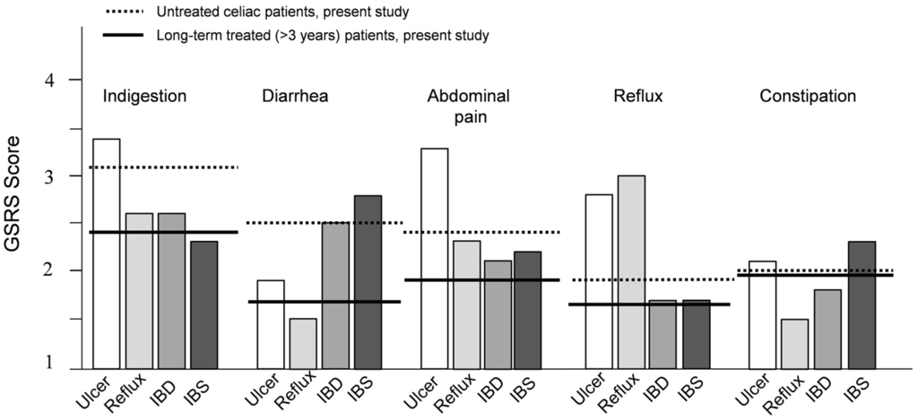 Besides between study groups, the GSRS scores in untreated and long-term treated celiac disease patients were compared with those seen in subjects with common gastrointestinal disorders, namely peptic ulcer, gastro-esophageal reflux disease (GER), inflammatory bowel disease (IBD) and irritable bowel syndrome (IBS) as established by literature search [11,13,14,15]. In all diseases the GSRS scores were from untreated patients at diagnosis except for IBD, where the subjects were on treatment.