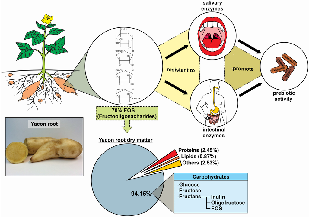 Yacon (Smallanthus sonchifolius), a perennial plant of the family Asteraceae native to the Andean regions of South America, is an abundant source of fructooligosaccharides (FOS). This comprehensive review of the literature addressed the role of yacon supplementation in promoting health and reducing the risk of chronic diseases. According to several preclinical and clinical trials, FOS intake favors the growth of health-promoting bacteria while reducing pathogenic bacteria populations. Moreover, the endproducts of FOS fermentation by the intestinal microbiota, short chain fatty acids (SCFA), act as substrates or signaling molecules in the regulation of the immune response, glucose homeostasis and lipid metabolism. As a result, glycemic levels, body weight and colon cancer risk can be reduced. Based on these findings, most studies reviewed concluded that due to their functional properties, yacon roots may be effectively used as a dietary supplement to prevent and treat chronic diseases.
