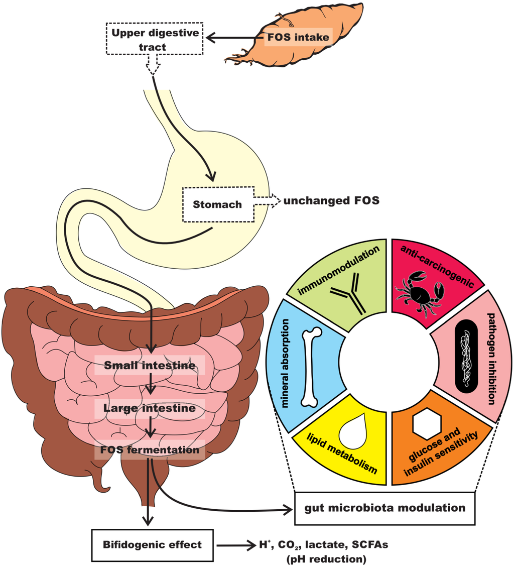 FOS are able to escape enzymatic digestion in the upper gastrointestinal tract, reaching the colon intact before undergoing microbial fermentation. FOS intake elicits a bifidogenic effect by selectively stimulating the proliferation of bifidobacteria, a group of beneficial bacteria naturally found in the human colon (Figure 2) [14,15,16]. Short chain fatty acids (SCFA), the endproducts of FOS fermentation by the intestinal microbiota, can also favor the growth of health-promoting bacteria such as Bifidobacterium spp. and Lactobacillus spp., while reducing or maintaining pathogenic populations (e.g., Clostridium spp. and Escherichia coli) at low levels [17,18,19]. Thus, FOS are small soluble dietary fibers that exhibit prebiotic activity.
