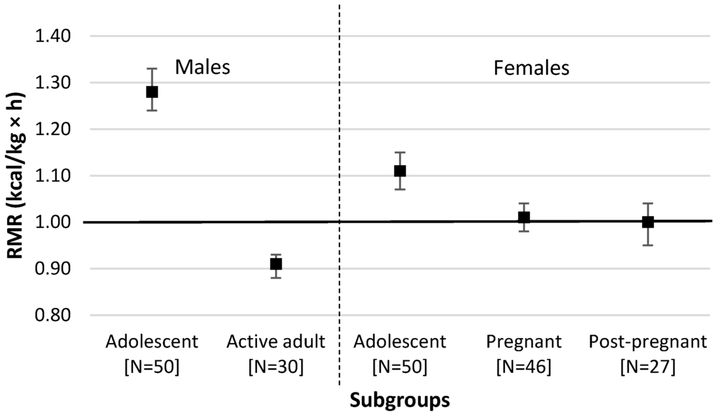 - Rieper, H.; Karst, H.; Noack, R.; Johnsen, D. Intra- and inter-individual variations in energy expenditure of 14–15-year-old schoolgirls as determined by indirect calorimetry. Br. J. Nutr. 1993, 69, 29–36. [Google Scholar] [CrossRef] [PubMed]