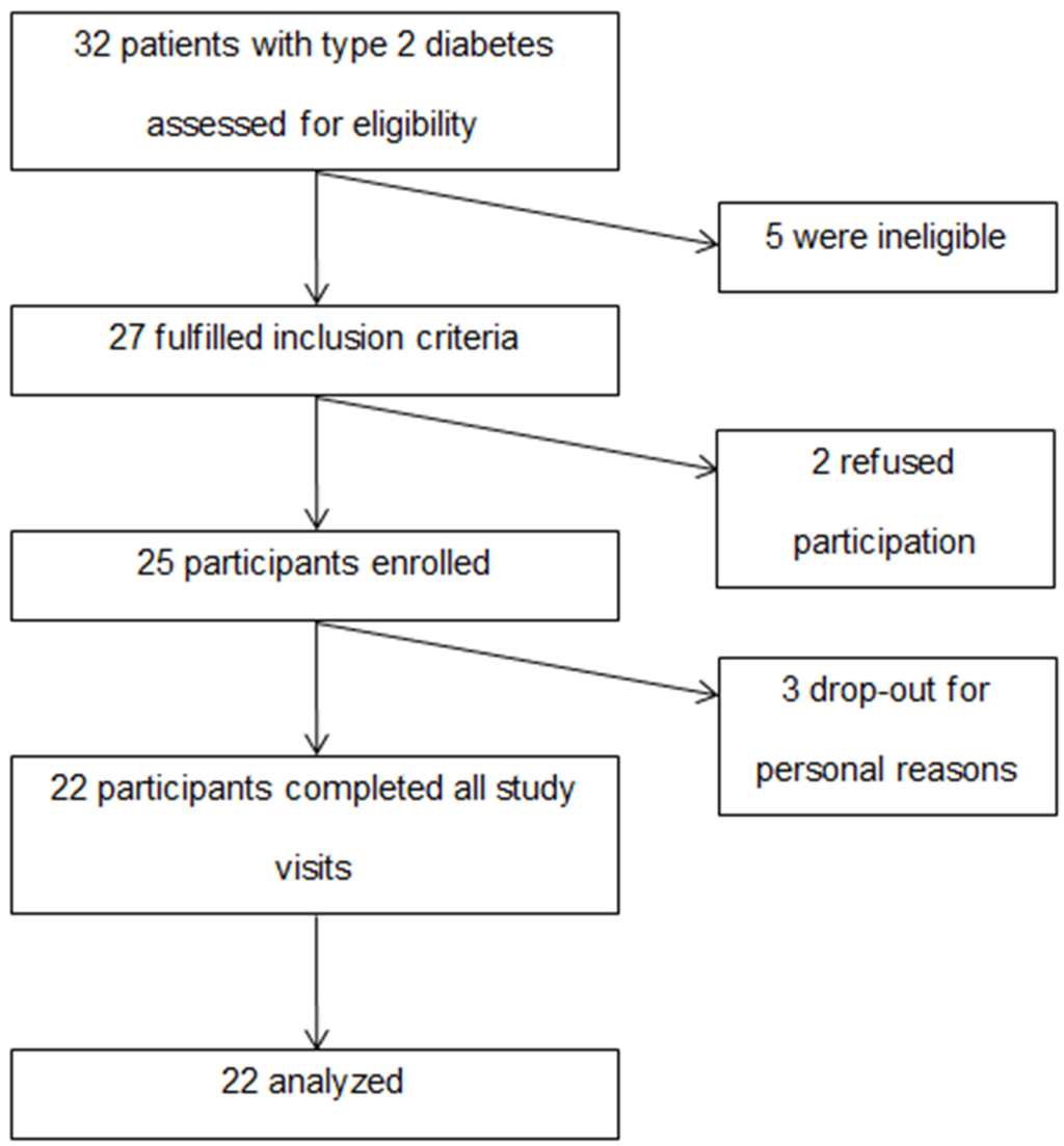 This was a cross-over, three-way and open-label clinical study conducted at Joslin Diabetes Center, Boston, MA, USA. The institution’s Committee on Human Studies approved the study protocol and participants signed its informed consent prior to enrollment. Trial Registration: NCT02691481 clinicaltrials.gov. Eligible participants were patients diagnosed with type 2 diabetes for ≥3 months, between age 18 and 75 years, BMI ≥ 25 kg/m2, hemoglobin A1C ≥ 6.5% and doses of anti-hyperglycemic or lipid lowering medications have to be stable for ≥3 months. Major study exclusion criteria included use of insulin or GLP-1 analogues for diabetes management, history of bariatric surgery, gastroparesis, malabsorption syndromes and pregnancy or lactation. Thirty-two patients with type 2 diabetes were assessed for eligibility. Five were ineligible due to the use of insulin and/or GLP-1 analogues or having a BMI < 25 kg/m2. Twenty-seven met our inclusion criteria from which 2 refused participation prior to signing the informed consent form. Twenty-five participants were enrolled, from which 22 participants completed all study visits (Figure 1). One participant dropped-out due to personal reasons prior to attending any study visit. Two participants dropped-out due to finding visit length and frequent blood drawing inconvenient, after each completing 1 study visit. Data from the three dropped-outs were excluded from our analysis. The mean age ± standard deviation (SD) of the 22 participants was 62.3 ± 6.8 years. Participants’ mean A1C ± SD was 6.8% ± 0.7% and mean diabetes duration ± SD was 9.5 ± 9.8 years. Demographic data of the study participants are shown in Table 1.