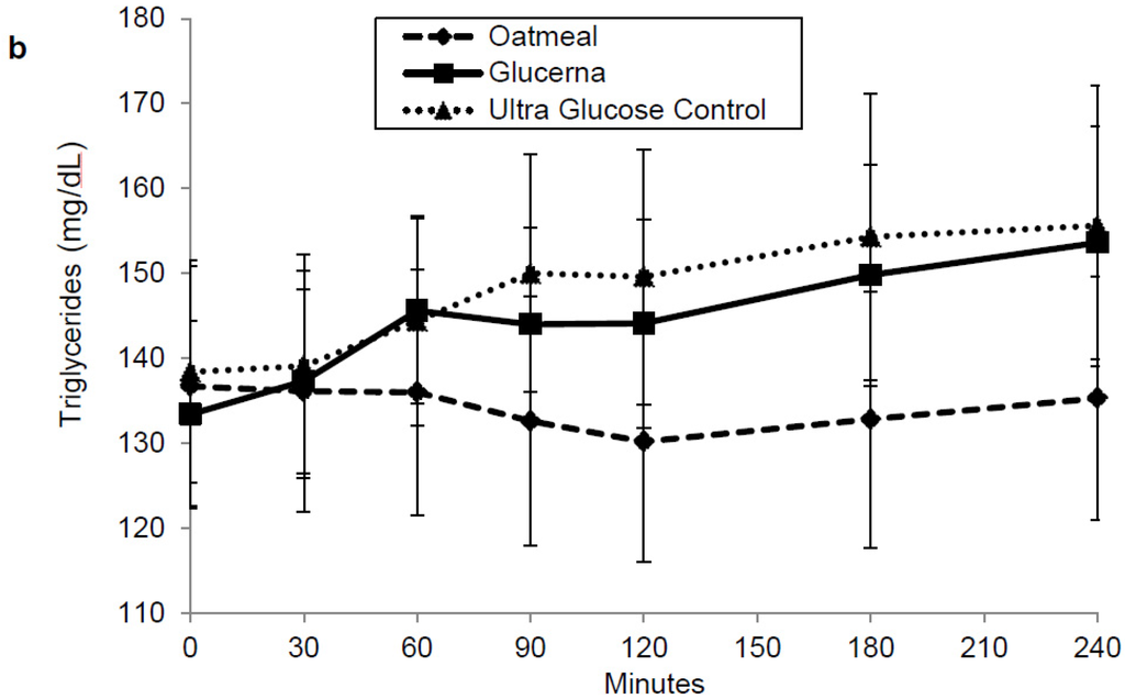 Mean baseline fasting serum free fatty acid before OM, GL and UGC at baseline were comparable (0.6 ± 0.05, 0.5 ± 0.04 and 0.6 ± 0.05 mg/dL, respectively). Free fatty acids AUC0–120 and AUC0–240 showed no significant difference between any of the breakfast meals (Figure 4a). Mean baseline fasting serum triglycerides before OM, GL and UGC at baseline were comparable (136.7 ± 14.1, 133.4 ± 11.0 and 138.4 ± 13.1 mg/dL, respectively). Triglycerides AUC0–120 and AUC0–240 showed no significant difference between any of the breakfast meals (Figure 4b).