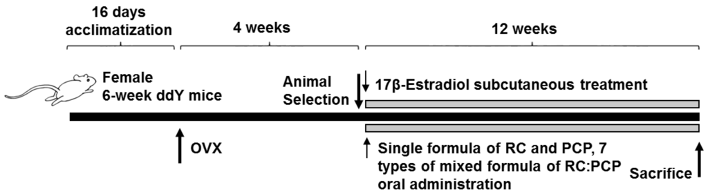 At 28 days after surgery, 8 mice per group were selected based on body weight and RC (120 mg/kg), PCP (120 mg/kg), or an RC:PCP mixture (g/g) was administered orally once a day for 84 days. Standardized RC, PCP, and RC:PCP 1:1, 1:2, 1:4, 1:8, 2:1, 4:1, and 8:1 (g/g) mixture were provided by HEALTH-LOVE Co., Ltd. (Anyang, Korea). The RC substance contained 8% total isoflavones, 0.62% genistein, 5.43% biochanin A, 3.66% formononetin, and 0.47% daidzein suspended in 12 mg/mL of distilled water. The PCP substance contained 0.90 mg/g of ellagic acid dissolved in 12 mg/mL of distilled water. Appropriate amounts of RC, PCP, and the RC:PCP mixture (g/g) were directly suspended or dissolved in distilled water and administered in a volume of 10 mL/kg. In OVX and sham control mice, only distilled water was administered orally as a vehicle in equal volumes and periods instead of the herbal formulas. In addition, 17β-estradiol (Sigma-Aldrich, St. Louis, MO, USA) 0.03 μg was dissolved in 0.2 mL of sterilized saline, and subcutaneously treated on the dorsal back skins in a volume of 0.2 mL/mouse (0.03 μg/head/day). After 84 days of continuous oral administration, the mice were anesthetized with 50 mg/kg of Zoletile and dissected according to established methods [] (Figure 1).