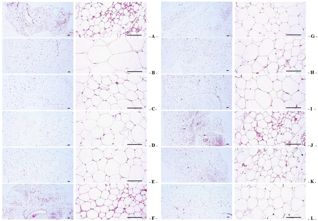 Representative histological images of the adipocytes, taken from sham-operated or OVX ddY mice abdominal fat pads deposited in abdominal cavity. (A) Sham vehicle control mice; (B) OVX control mice; (C) 17β-estradiol OVX induced mice; (D) RC alone administered OVX induced mice; (E) PCP alone administered OVX induced mice; (F–L) RC:PCP 1:1, 1:2, 1:4, 1:8, 2:1, 4:1, and 8:1 mixtures administered OVX-induced mice, respectively. OVX = Ovariectomy; RC = Red clover dry extracts; PCP = Pomegranate Concentrate Powder; RC:PCP = Mixed formulations consisted of RC and PCP (g/g). All H&E stain. Scale bars = 120 μm.