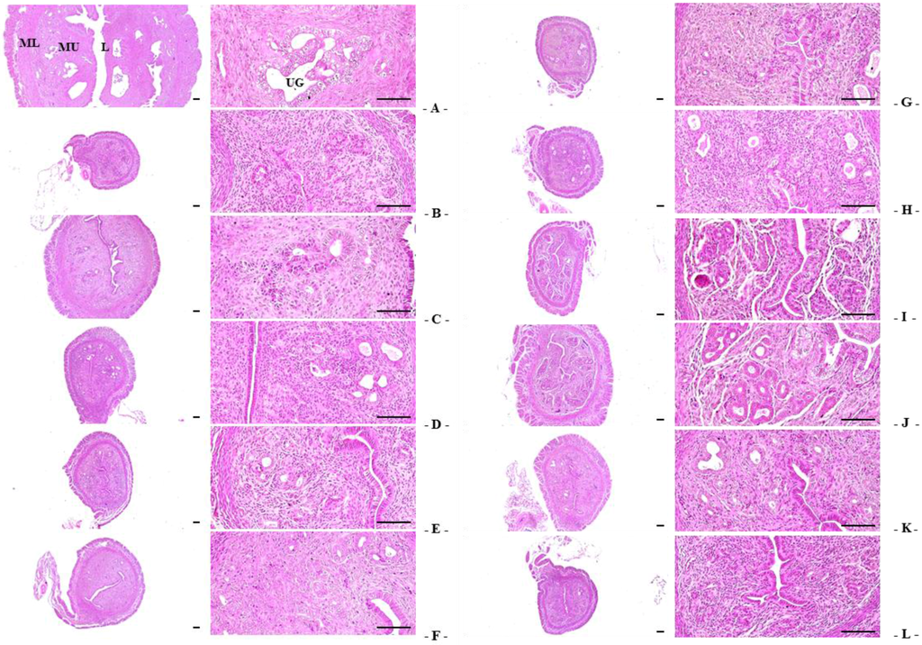 Representative histological images of the left uterus horn, taken from sham-operated or OVX ddY mice. (A) Sham vehicle control mice; (B) OVX control mice; (C) 17β-estradiol OVX induced mice; (D) RC alone administered OVX induced mice; (E) PCP alone administered OVX induced mice; (F–L) RC:PCP 1:1, 1:2, 1:4, 1:8, 2:1, 4:1, and 8:1 mixtures administered OVX-induced mice, respectively. OVX = Ovariectomy; RC = Red clover dry extracts; PCP = Pomegranate Concentrate Powder; RC:PCP = Mixed formulations consisted of RC and PCP (g/g); L = Lumen; MU = Mucosa; ML = Muscular layer; UG = Uterine gland. All H&E stain. Scale bars = 120 μm.