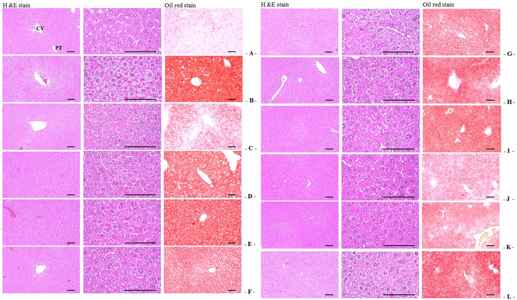 Representative histological images of the left lateral lobes of liver, taken from sham-operated or OVX ddY mice. (A) Sham vehicle control mice; (B) OVX control mice; (C) 17β-estradiol OVX induced mice; (D) RC alone administered OVX induced mice; (E) PCP alone administered OVX induced mice; (F–L) RC:PCP 1:1, 1:2, 1:4, 1:8, 2:1, 4:1, and 8:1 mixtures administered OVX-induced mice, respectively. OVX = Ovariectomy; RC = Red clover dry extracts; PCP = Pomegranate Concentrate Powder; RC:PCP = Mixed formulations consisted of RC and PCP (g/g); CV = Central vein; PT = Portal Triad. Scale bars = 120 μm.