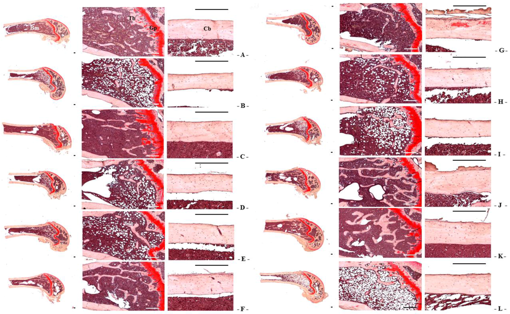 Representative histological profiles of the left femur, taken from sham-operated or OVX ddY mice. (A) Sham vehicle control mice; (B) OVX control mice; (C) 17β-estradiol OVX induced mice; (D) RC alone administered OVX induced mice; (E) PCP alone administered OVX induced mice; (F–L) RC:PCP 1:1, 1:2, 1:4, 1:8, 2:1, 4:1, and 8:1 mixtures administered OVX-induced mice, respectively. OVX = Ovariectomy; RC = Red clover dry extracts; PCP = Pomegranate Concentrate Powder; RC:PCP = Mixed formulations consisted of RC and PCP (g/g); Cb = cortical bone; Tb = trabecular bone; Bm = bone marrow; Gp = growth plate. All Safranin O stain. Scale bars = 240 μm.