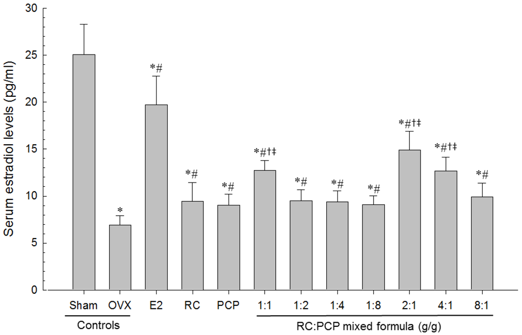 The dose level of 120 mg/kg was selected as dosages of mixed formula consisted of RC:PCP on the clinical dosage in human (mouse dosage = about 12-fold that of human dosage; (600 mg/60 kg) × 12 = 120 mg/kg). The experimental groups were divided into the following 12 groups (8 mice per group): sham vehicle control (sham control); OVX-operated (OVX control); OVX-operated mice + 17β-estradiol (0.03 μg/head); OVX-operated mice + 120 mg/kg RC; OVX-operated mice + 120 mg/kg PCP; OVX-operated mice + 120 mg/kg RC:PCP 1:1 (60:60 mg/kg) mixture; OVX-operated mice + 120 mg/kg RC:PCP 1:2 (40:80 mg/kg) mixture; OVX-operated mice + 120 mg/kg RC:PCP 1:4 (24:96 mg/kg) mixture; OVX-operated mice + 120 mg/kg RC:PCP 1:8 (13:107 mg/kg) mixture; OVX-operated mice + 120 mg/kg RC:PCP 2:1 (80:40 mg/kg) mixture; OVX-operated mice + 120 mg/kg RC:PCP 4:1 (96:24 mg/kg) mixture; OVX-operated mice + 120 mg/kg RC:PCP 8:1 (107:13 mg/kg) (g/g) mixture.
