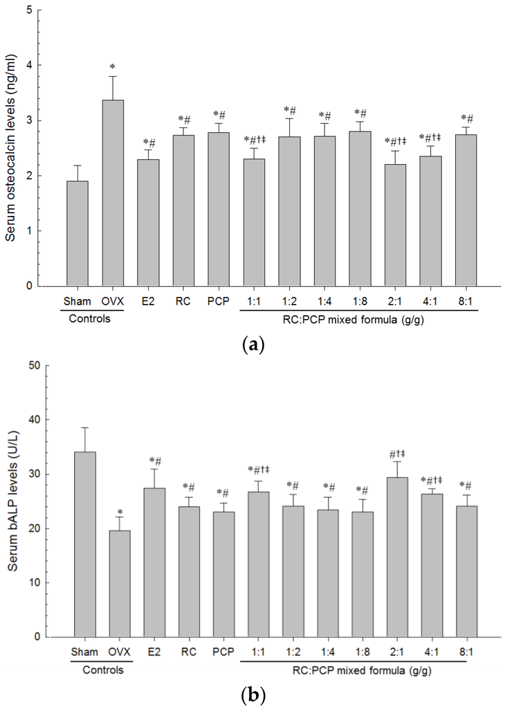Serum (a) Osteocalcin and (b) bALP Levels in Sham-operated or OVX ddY Mice. Values are expressed mean ± S.D. of eight mice. OVX = Ovariectomy; E2 = 17β-estradiol; RC = Red clover dry extracts; PCP = Pomegranate Concentrate Powder; RC:PCP = Mixed formulations consisted of RC and PCP (g/g). * p < 0.05 as compared with sham control; # p < 0.05 as compared with OVX control; † p < 0.05 as compared with RC single formula treated mice; ‡ p < 0.05 as compared with PCP single formula treated mice.