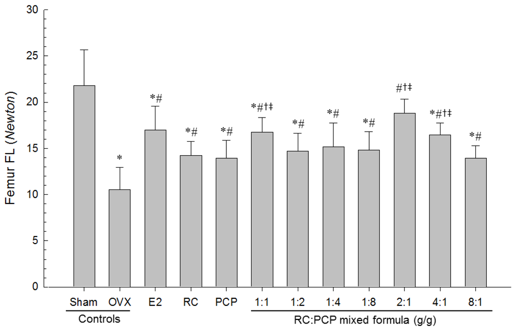 Femur FL in Sham-operated or OVX ddY mice. Values are expressed mean ± S.D. of eight mice. OVX = Ovariectomy; E2 = 17β-estradiol; RC = Red clover dry extracts; PCP = Pomegranate Concentrate Powder; RC:PCP = Mixed formulations consisted of RC and PCP (g/g); FL = Failure load, bone strength. * p < 0.05 as compared with sham control; # p < 0.05 as compared with OVX control; † p < 0.05 as compared with RC single formula treated mice; ‡ p < 0.05 as compared with PCP single formula treated mice.