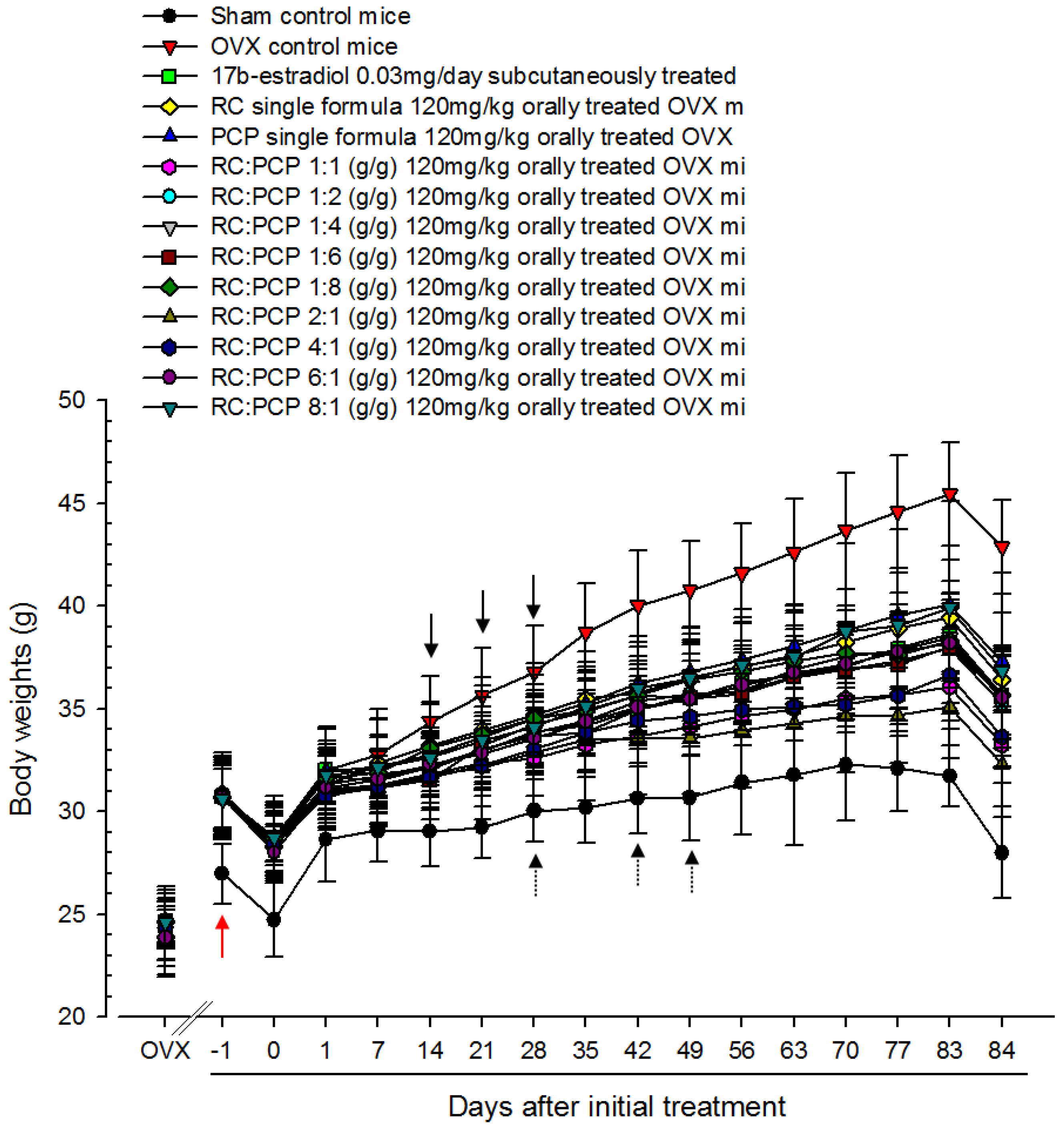 Compared with sham control mice at 1, 3, 7, 28, 56, and 83 days after initial administration, OVX-induced mice showed significant increases in food consumption. No significant change in daily food consumption was observed in the RC alone, PCP alone, or any of the seven RC:PCP mixed formula-treated mice, compared with OVX control mice (Appendix B).