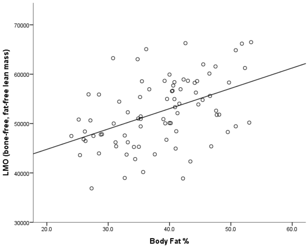 A significant, positive correlation (Figure 1) was also shown between lean mass and body fat % (r = 46, n = 83, p < 0.001); however, this relationship did not cause multicollinearity in the regression model.