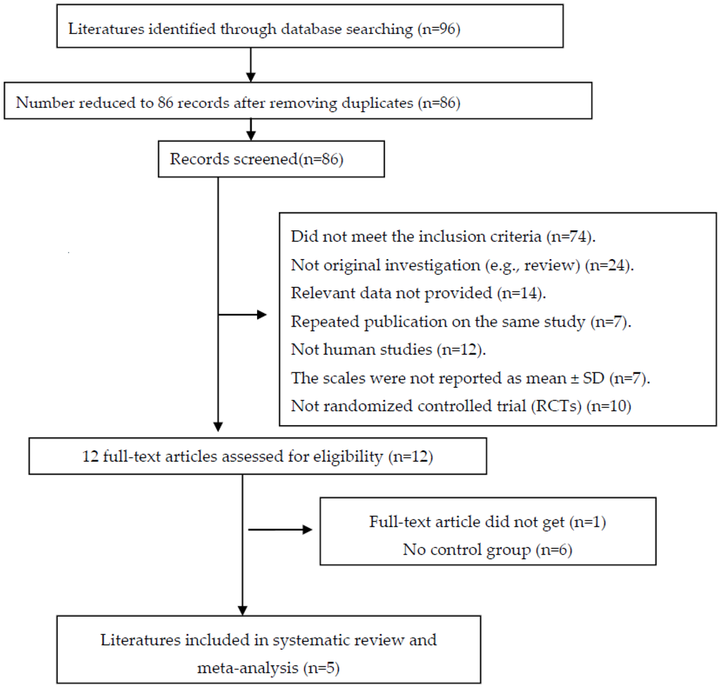 Two reviewers searched databases and other sources including PubMed, Medline, Springer, Elsevier Science, EMBASE, Cochrane Library, China Knowledge Resource Integrated (CNKI) from the earliest record of the databases to 1 January 2016, using the search terms “probiotics”, “prebiotics”, “Lactobacillus”, “Bifidobacterium”, “saccharomyces”, “depression” or “mental health”. References from these publications were also reviewed to identify additional studies. Publications were limited to the English language, and literature that only had conference abstracts were excluded due to the lack of sufficient data.