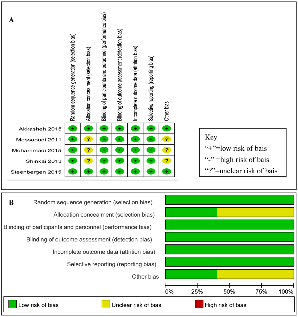 Risk of bias for efficacy analysis for each included RCT is shown in Figure 2A and Figure 3B shows the risk of bias across all RCTs. These data show that the highest overall risk of bias was in relation to performance and detection. According to the quality assessment of studies, the five studies included were all RCTs, and the risk of bias for each RCT included was low.