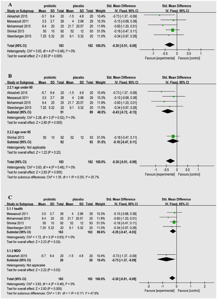 (A) estimates for probiotics associated with depression in the meta-analysis; (B) forest plots for different ages; and (C) forest plots for depression status.