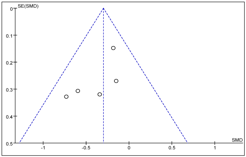 A funnel plot was used to qualitatively assess for publication bias. The funnel plot shown in Figure 4 is partially symmetrical, indicating no obvious evidence of asymmetry, and, therefore, no evidence of publication bias.