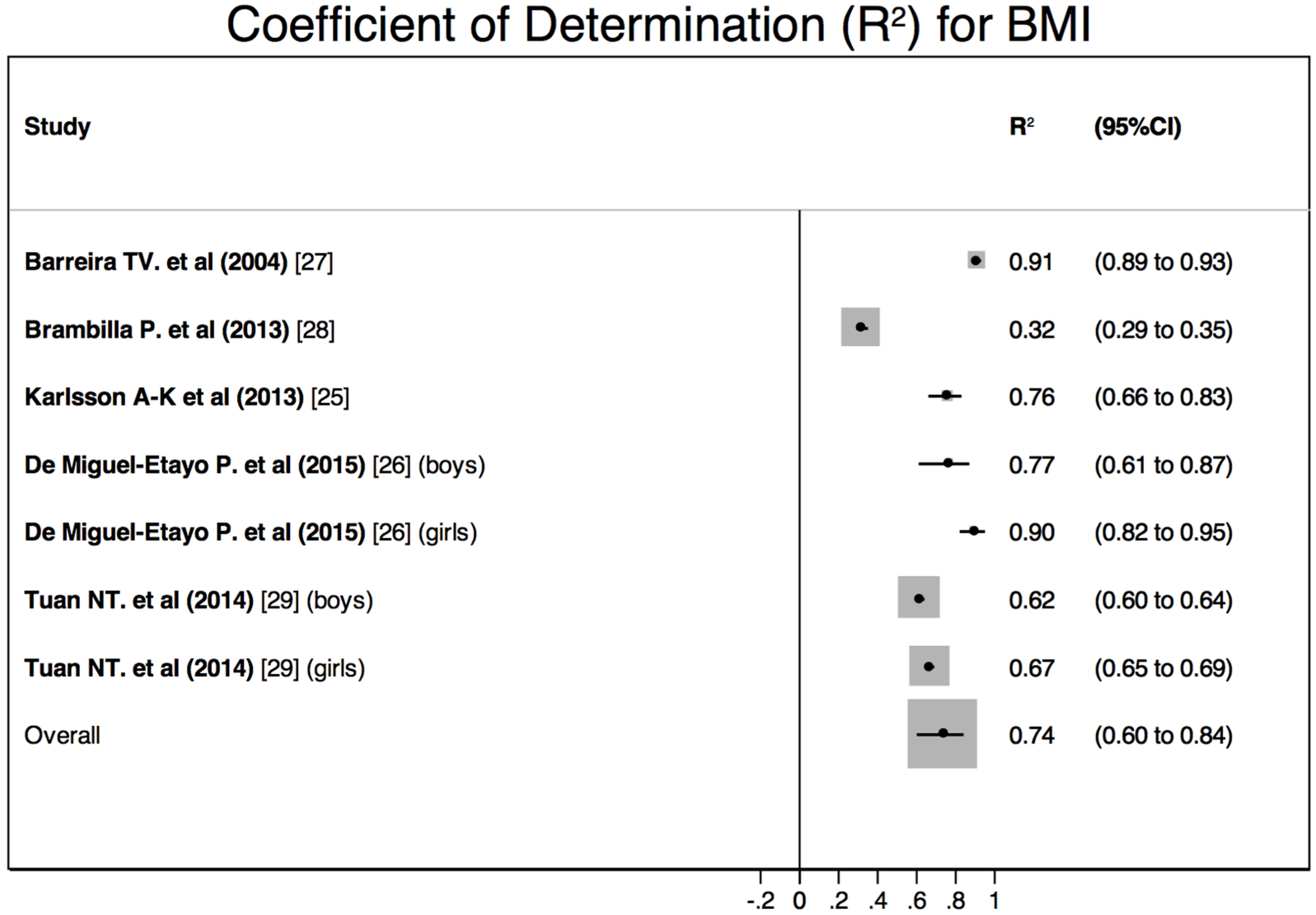 Results of the quantitative meta-analysis: Pooled coefficient of determination (R2) for BMI to assess BF measured by DEXA.
