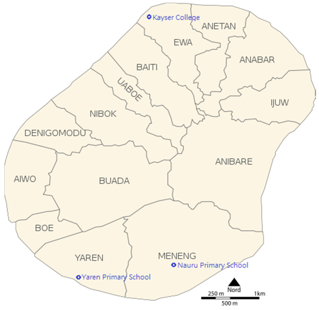 This survey was a collaborative initiative between the Nauru Ministry of Health, Taiwan Ministry of Foreign Affairs, and Taipei Veterans General Hospital, Taiwan. Ethical approval was granted by the Nauru Non-communicable Disease Steering Committee, Nauru Ministry of Health (20150917). This research was designed as a school-based survey to collect nationally representative data of iodine status in Nauru. All three primary schools (Yaren Primary School, Nauru Primary School, and Kayser College, Figure 1) in Nauru with students aged 6–12 years participated in the study. Participating students were randomly selected by the Statistics Division of the Ministry of Education, Nauru, to represent their age, gender, and region of residence. Students were asked to provide a random spot urine sample and fill out a short Food Frequency Questionnaire (FFQ). Informed consent was signed by one of the parents of the enrolled school children. A total of 242 students (126 males, 116 females) aged 6–12 years successfully participated in this study. To determine the source of iodine nutrition, water samples from different regions were collected and analyzed. The iodine content in salt products in Nauru was also measured.