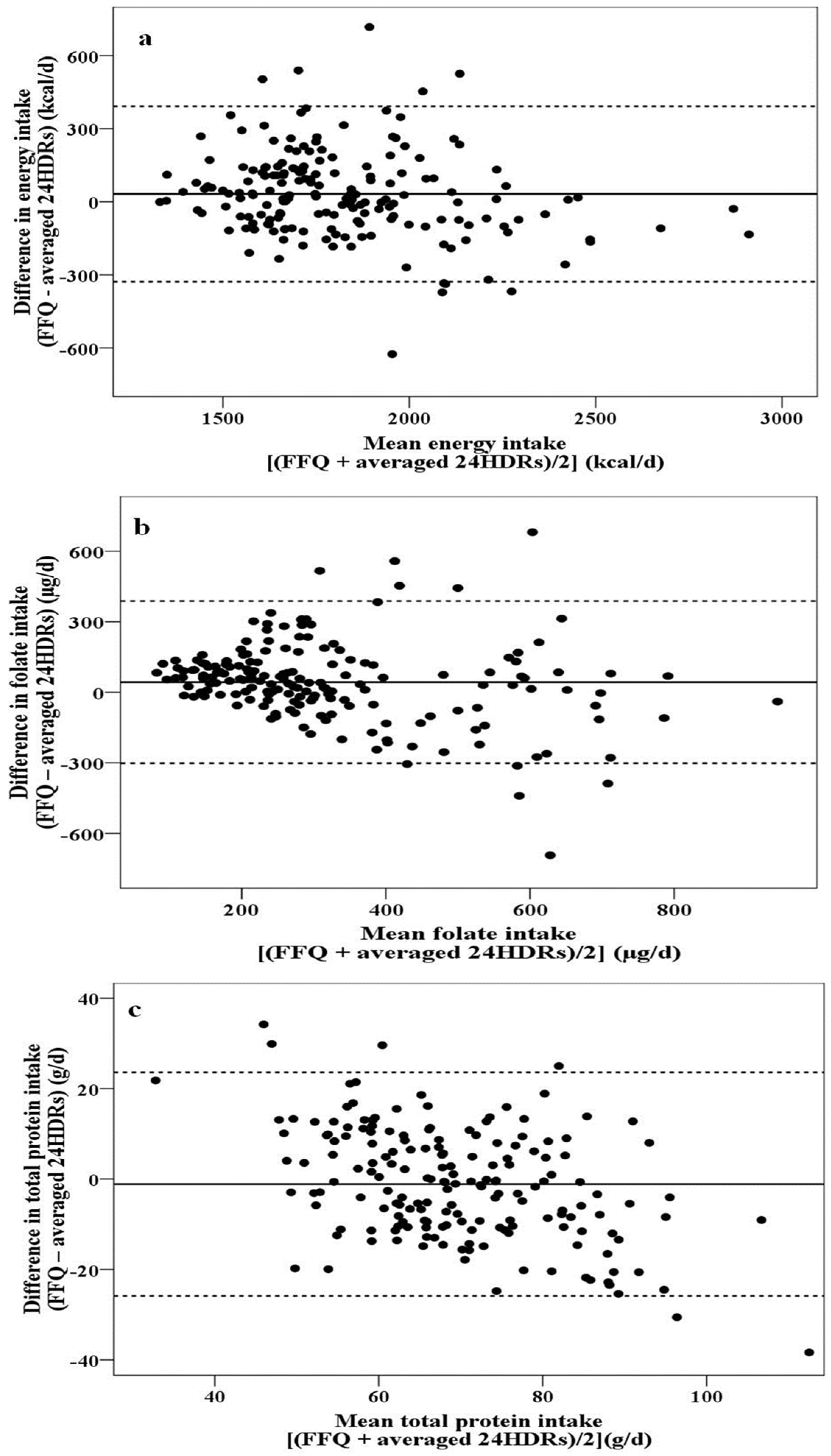 - increasing negative differences with increasing mean values were noted (Figure 2c), meaning that, compared with the FFQ, the 24HDRs overestimate the intake as the intake quantity increases (total protein, plant protein, animal protein, percentage of energy derived from total protein, percentage of energy derived from plant protein, percentage of energy derived from animal protein, vitamin A, and sodium).