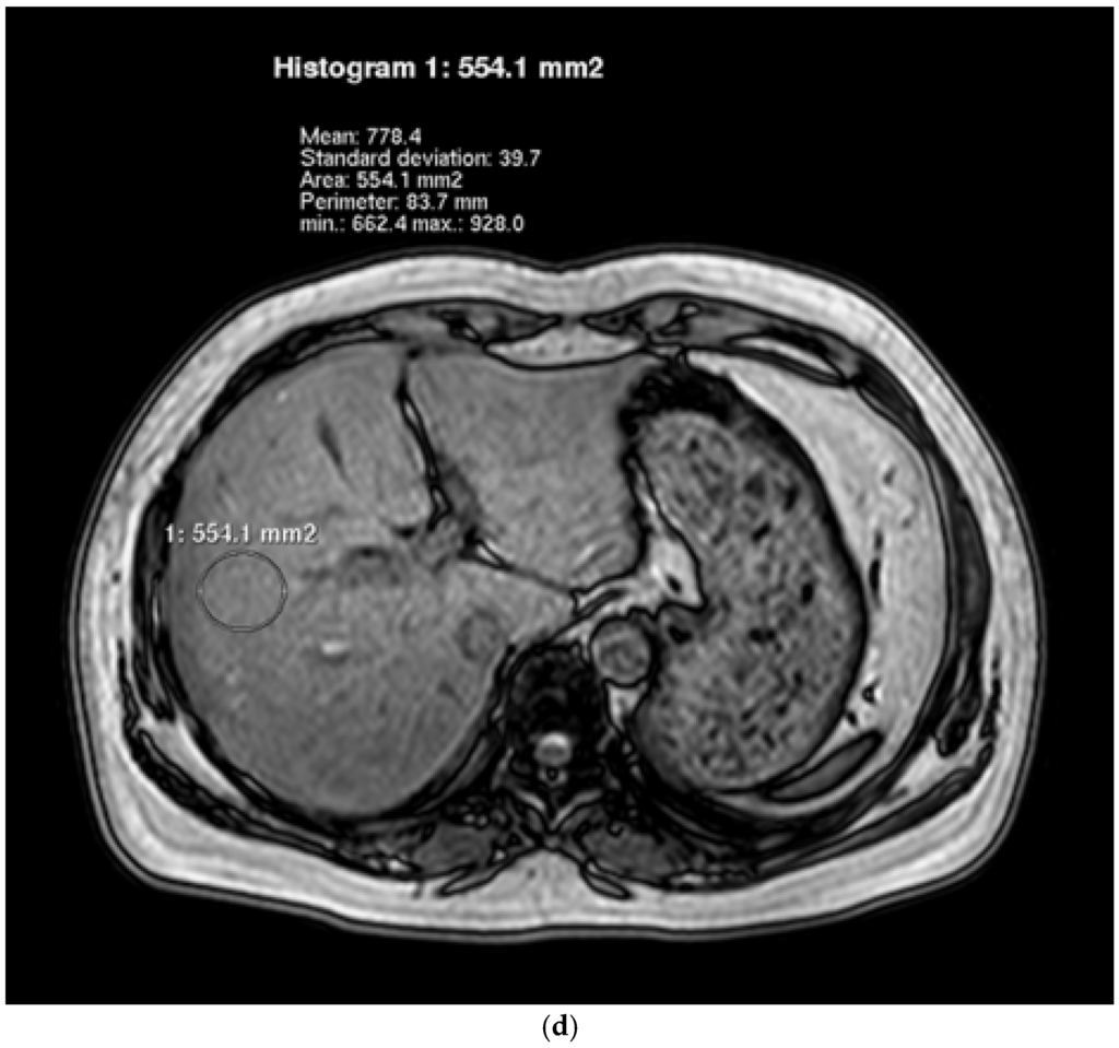 Representative IP (a,c) and OP (b,d) images of livers obtained by using dual-echo sequence. Images of a NAFLD patient and a healthy individual were, respectively, Figure 1a–d.