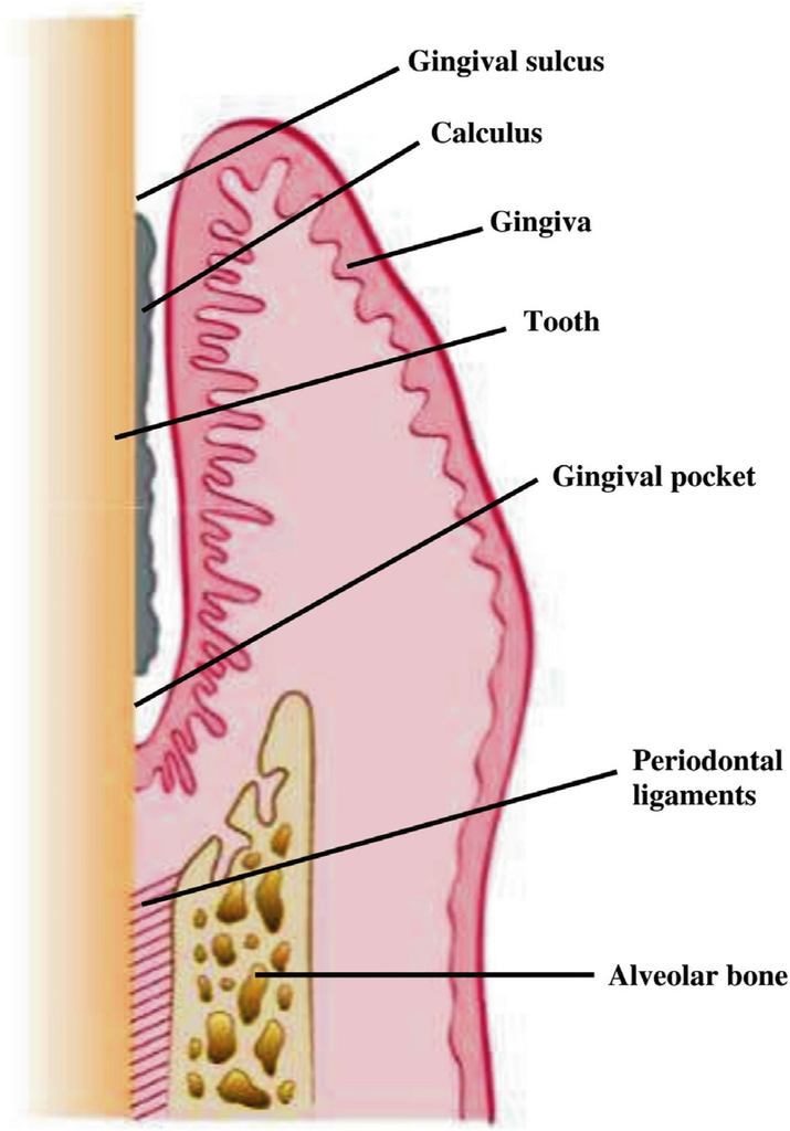 Management of periodontitis is achieved mainly by removing the causative factors (dental plaque, microbial biofilm, and calculus) by means of scaling and root planing along with oral hygiene instructions [21,22]. The relationship of calculus, gingival pocket, and periodontal tissues is shown in Figure 1. Antibiotics are considered helpful in severe conditions or in the case of systemic involvement [23]. In order to enhance the functional life of natural teeth with severe periodontal bone loss, guided tissue regeneration (GTR) and bone grafting are employed [24,25]. Implant therapy is used to replace teeth lost due to extensive and uncontrolled degeneration of bone and periodontal tissues [26,27].