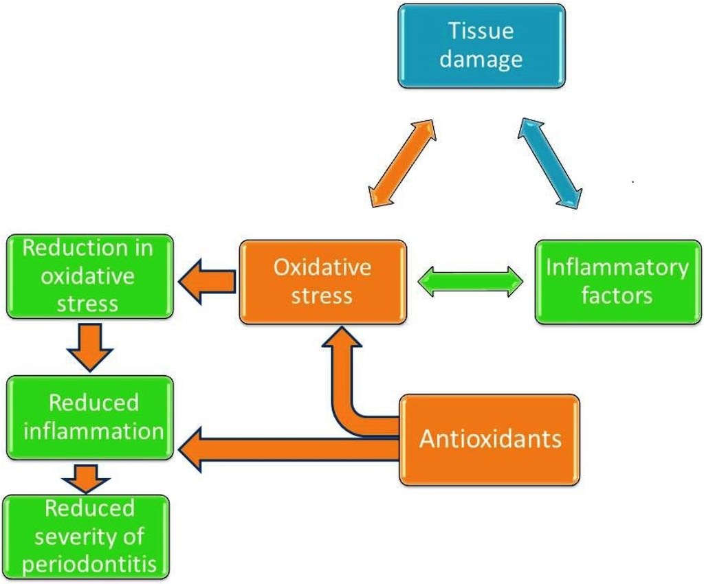 Periodontal disease is a complex process of infective and inflammatory processes leading to production of reactive oxidative species (ROS), which in turn worsen periodontitis. Antioxidants may improve periodontal health and outcomes of periodontal therapy by reducing the oxidative stress via scavenging ROS.