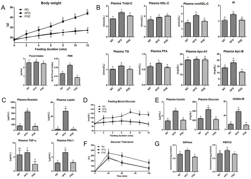 3.3. PGE Improved Insulin Resistance and Glucose Tolerance by Modulating Activities of Hepatic Glucose-Regulating Enzymes in DIO Mice
