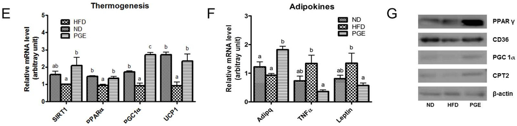 3.4. PGE Supplement Decreased Body Fat Mass by Increasing Fatty Acid Oxidation-Related Gene Expression and Energy Expenditure in DIO Mice