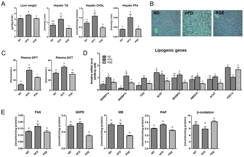 3.5. PGE Supplement Lowered the Levels of Hepatic Lipids and Lipotoxicity Markers by Altering Hepatic Lipogenic Gene Expression and Enzyme Activities in DIO Mice