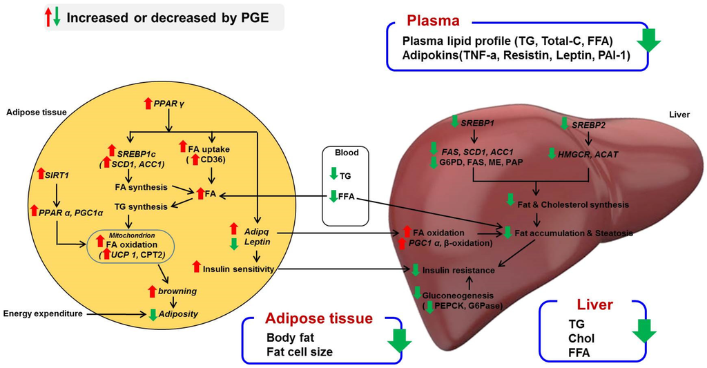 4.2. PGE Lowered Inflammatory Adipokines and Improved Insulin Resistance and Hepatic Steatosis by Alteration of Lipogenic Gene Expression and Glucose Metabolism