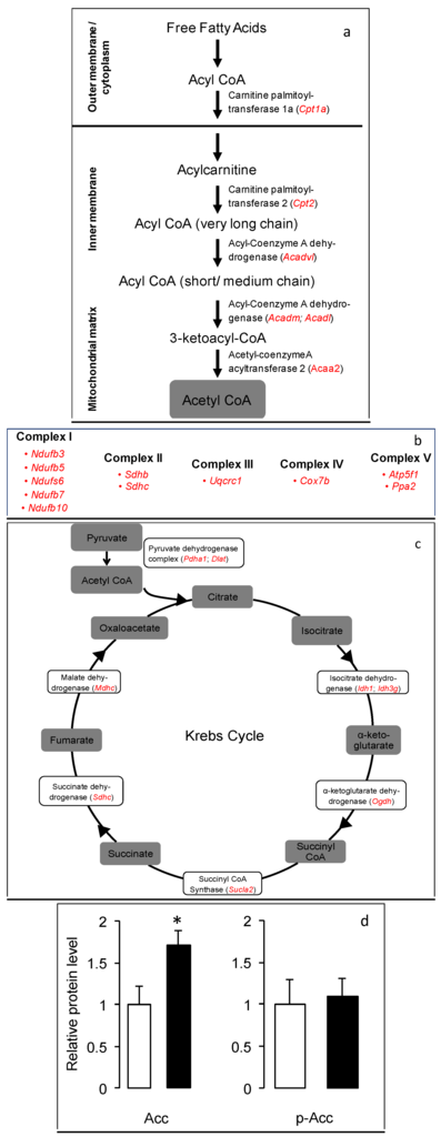 Pathway analysis of the gSkM transcriptome for the comparison of HFD-ED and HFD-corn oil fed mice. The illustration is based on the Kegg pathway database (http://www.genome.jp/kegg/pathway.html). (a) Fatty acid β-oxidation: Genes highlighted in red are upregulated in gSkM of mice fed HFD-ED compared with HFD-corn oil; (b) Electron transport chain: Genes highlighted in red are upregulated in gSkM of mice fed HFD-ED compared with HFD-corn oil; (c) Krebs Cycle: Genes highlighted in red are upregulated in gSkM of mice fed HFD-ED compared with HFD-corn oil; (d) Relative Acc protein levels in HFD-ED (white bars) fed mice was lower than HFD-corn oil (black bars) and there was no difference in the phosphorylation of Acc (p-Acc) protein after 8-weeks diet intervention. * Different at p < 0.05.