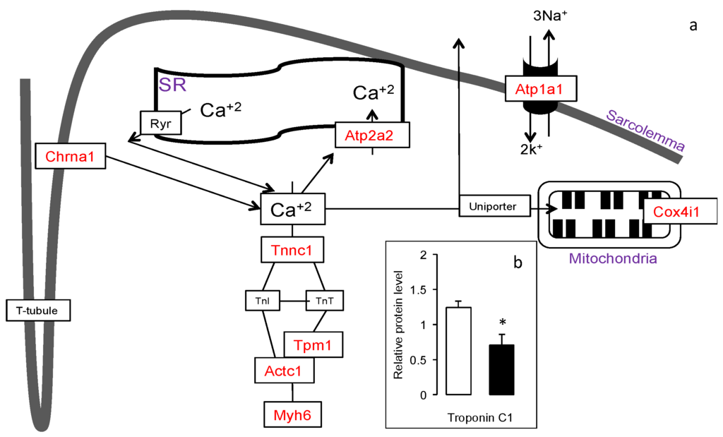 Pathway analysis of the gSkM transcriptome for the comparison HFD-ED versus HFD-corn oil fed mice. The illustration is based on the Kegg pathway database (http://www.genome.jp/kegg/pathway.html). (a) Nerve-Muscle contraction: Genes highlighted in red are upregulated in gSkM of mice fed HFD-ED compared with HFD-corn oil; (b) Relative Troponin C1 protein level in HFD-corn oil (black bars) fed mice was lower than HFD-ED (white bars). * Different at p < 0.05.