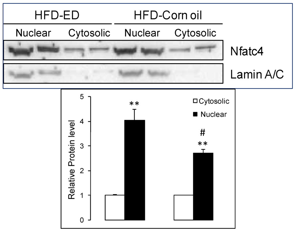 Representative Western blot is shown with LaminA/C loading control. Nuclear (black bars) and cytosolic (white bars) protein extract from the gSkM of HFD-ED (left-panel) and HFD-corn oil (right-panel) were analyzed by Western blot using antibodies for total anti-Nfatc4 antibody and the cytosolic protein levels in the HFD-ED was kept to 1. Different at ** p < 0.05 and # p < 0.01.