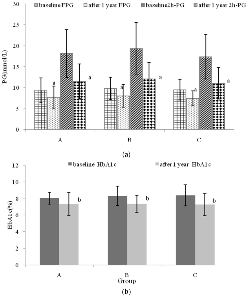 One-year later, PG and HbA1c decreased significantly (p < 0.05) (Figure 2). FPG decreased significantly (p < 0.05) from 9.35 ± 3.1, 9.83 ± 2.6 and 9.48 ± 2.8 mmol/L in Group A, B, and C to 7.66 ± 2.5 (8.02 ± 1.9 and 7.44 ± 2.0 mmol/L in Group A, B, and C, while, 2h-PG declined significantly (p < 0.05) from 18.14 ± 5.2, 19.36 ± 5.3 and 17.36 ± 5.1 mmol/L in Group A, B, and C to 11.51 ± 4.7, 12.05 ± 4.5 and 11.05 ± 4.3 mmol/L in Group A, B, and C, respectively. Also, HbA1c decreased obviously (p < 0.05) from 8.02% ± 0.93%, 8.30% ± 1.02% and 8.35% ± 1.04% in Group A, B, and C to 7.32% ± 1.24%, 7.34% ± 1.04% and 7.26% ± 1.30% in Group A, B, and C, respectively (Figure 2b). It was observed from Figure 2c that the reduction of FPG, 2h-PG and HbA1c in Group A was smaller than that in Groups B and C after one year of intervention, the FPG of Group C decreased to a greater extent (23.79%) than it did in Group A (14.29%) (p < 0.05).