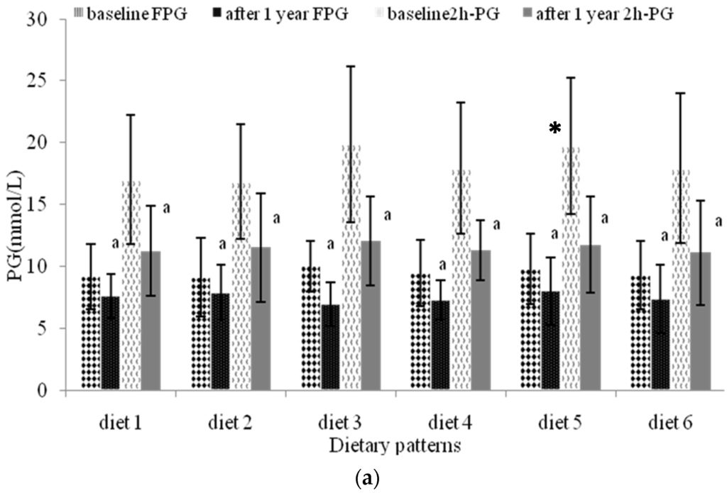 Differences in the participants’ dietary patterns have an impact on their PG levels (Figure 3). FPG and 2h-PG decreased significantly (p < 0.05) after the one-year intervention. Participants who selected “Japanese” diet presented the lowest FPG among the six patterns (p < 0.05). The 2h-PG value at baseline for participants who selected the “Japanese” and “Healthy” diets were relatively high. “Healthy” diet yielded higher 2h-PG than “Traditional ”diet (p < 0.05), while the new 2h-PG values after the one-year intervention were close to normal. Figure 3b shows where the HbA1c values also significantly decreased after one year (p < 0.05). At baseline, the HbA1c value of “Healthy” diet was highest and was significantly lower than “Vegetarian” diet after one year (p < 0.05). Reduction of FPG, 2h-PG, and HbA1c are shown in Figure 3c. The HbA1c reduction in “Healthy” diet was highest (19.42%)—considerably higher than “traditional diet” (5.02%) (p < 0.05) and “vegetarian diet” (6.21%) (p < 0.05), and “Vegetarian” diet resulted in the highest 2h-PG among all six diets (p < 0.05). FPG reduction was most obvious in “Japanese” diet.
