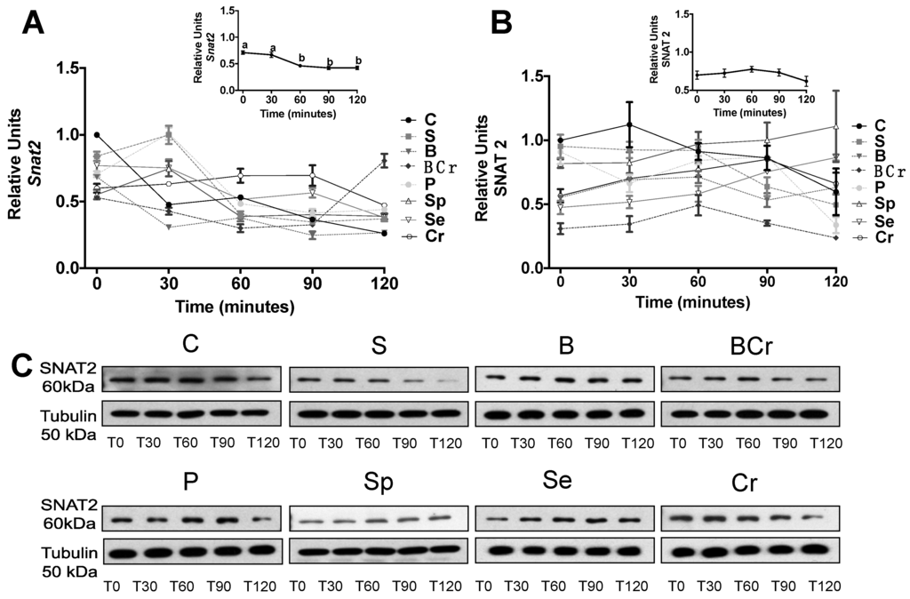 Gene and protein expression of SNAT2 was not modified by the type of dietary protein (Figure 3A,B), however it was increased during the fasting period and decreased after feeding period (inset Figure 3A,B) (p < 0.05).
