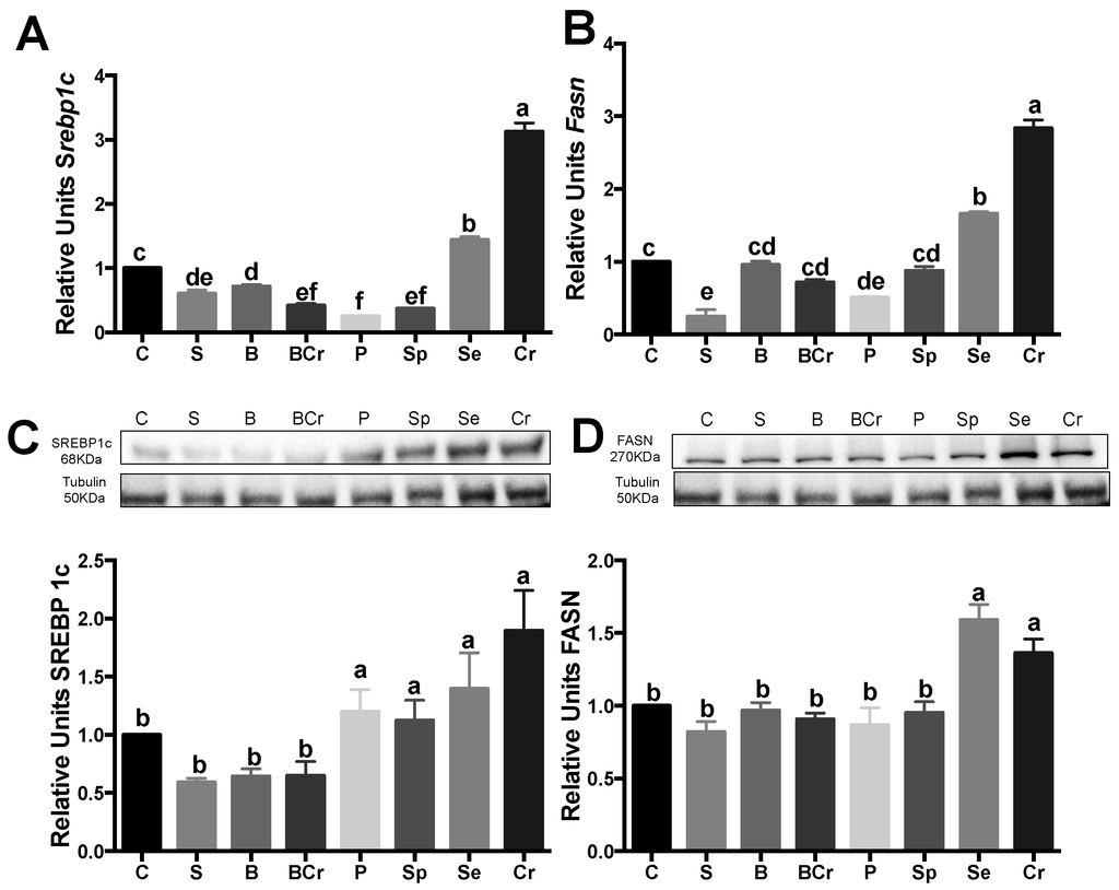 Srebp1c gene expression was significantly increased in the C, Cr and LP groups (p < 0.05), and, interestingly, the S group showed the lowest expression of Srebp1c (p < 0.05) (Figure 8A). SREBP1c protein expression was significantly increased (p < 0.05) in the Cr group by 2.7-fold in comparison with the LP group (Figure 8C). The gene expression of Fasn was significantly increased (p < 0.05) in the Cr group, and the rats fed S had the lowest expression of Fasn (p < 0.05) (Figure 8B). The highest protein expression of FASN was observed in the Cr group and was significantly decreased by the combination of Cr with S or B (Figure 8D).