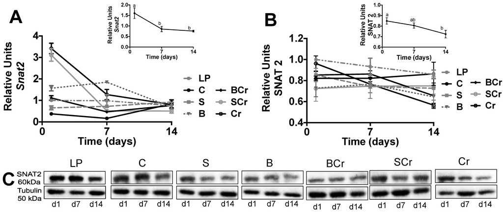 Previous studies demonstrated that SNAT2 was upregulated in response to amino acid deprivation [42]. Thus, we evaluated SNAT2 as a possible amino acid sensor and if it could be regulated by the physiological state. The gene expression of Snat2 was significantly increased (p < 0.05) in the SCr and Cr groups after one day of eating the experimental diets (Figure 6A); interestingly after seven and 14 days of eating the experimental diets there is a significant decrease (p < 0.05) in the gene expression of Snat2 (Figure 6B) regardless the experimental diet indicating adaptive regulation, a process in which amino acid starvation induces the transport activity [43]. The protein expression of SNAT2 was significantly elevated (p < 0.05) after one day of eating the experimental diets and decreased after seven and 14 days of dietary protein rehabilitation (Figure 6C).