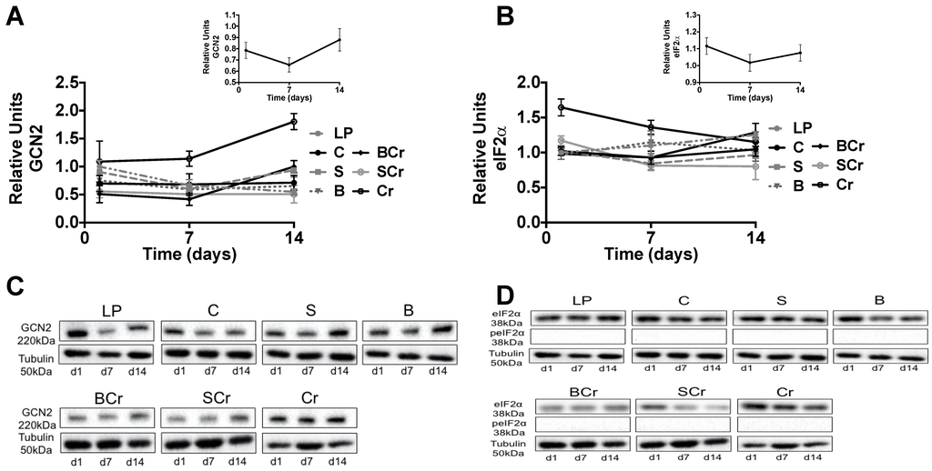 Rats fed Cr showed the highest expression of GCN2 after seven and 14 days (p < 0.0001) of eating the experimental diets, while rats fed C, S, B, BCr or SCr showed the lowest expression of GCN2 (Figure 7A,C). Despite the abundance of GCN2 in all groups, we did not observed phosphorylation of its target protein eIF2α (Figure 7B,D).