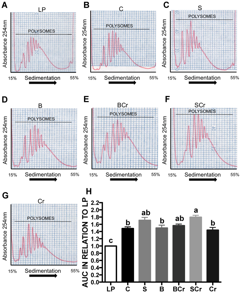 The results indicate that each type of dietary protein generates a specific pattern of expression and phosphorylation of factors involved in the initiation of translation leading to a specific pattern of polysome formation. In general, there was a significant increase (p < 0.05) in polysome formation in all groups in comparison with the LP group (Figure 9A–G). The polysome profiles in the livers of rats fed SCr, S and BCr showed the highest polysome formation (Figure 9H) indicating a possible increase in the initiation of protein translation.