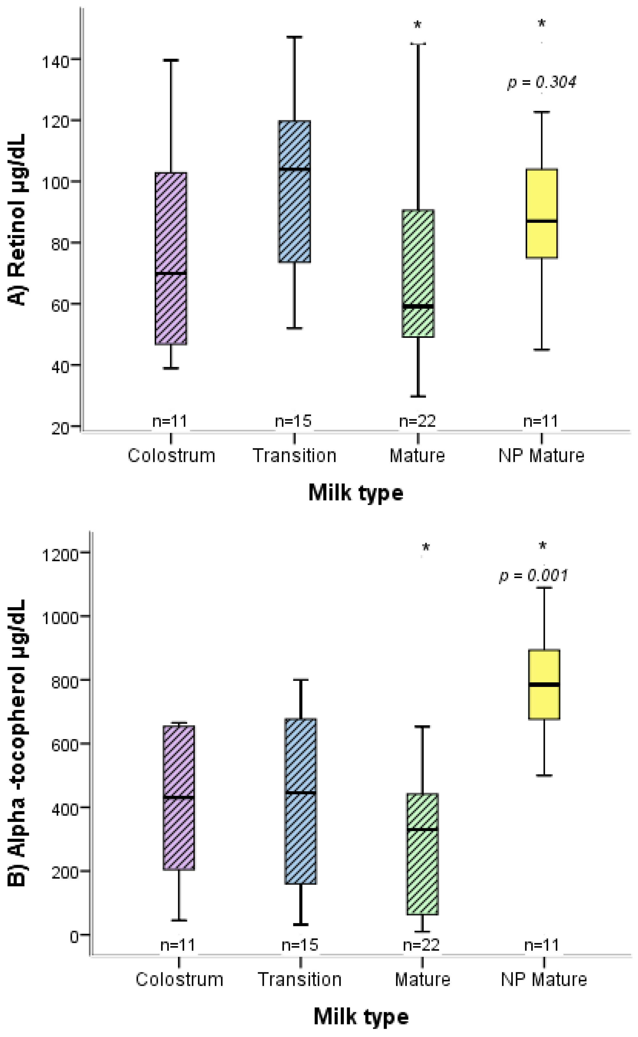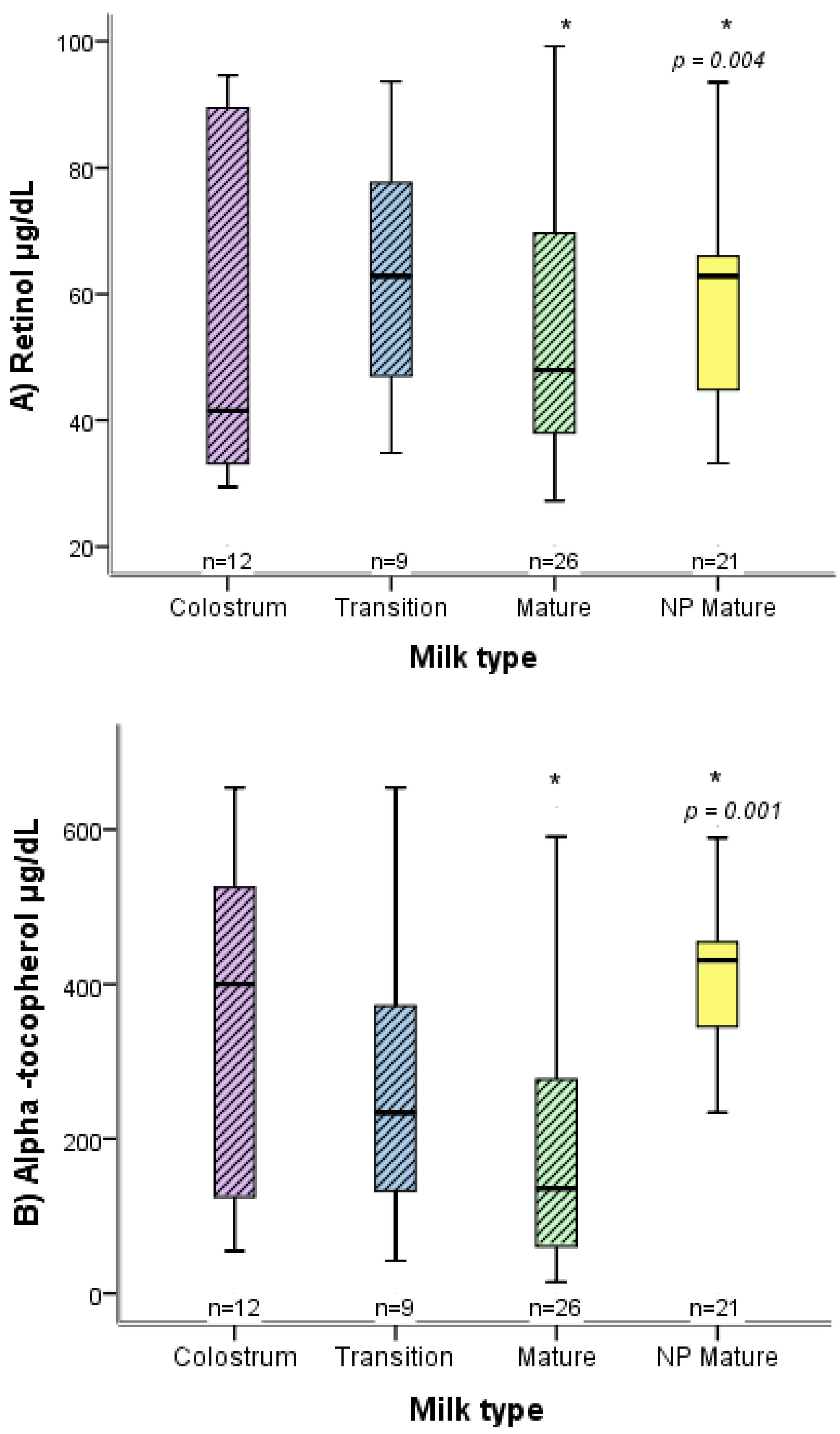 Concentration of retinol and α-tocopherol in relation to the type of breast milk.