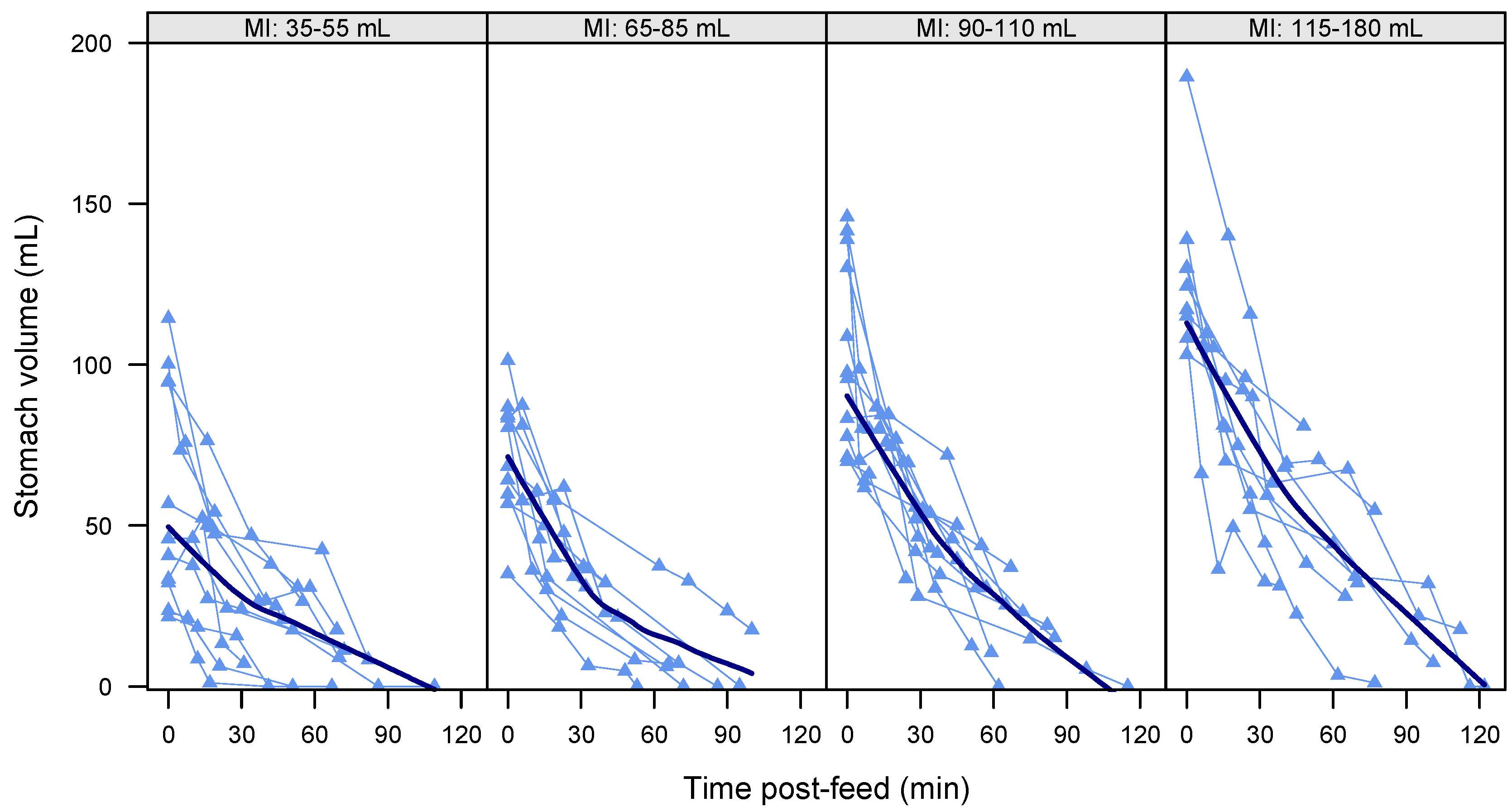 | Predictors | Feed Volume a | Gastric Emptying Time a | Post-Feed Stomach Volumes b | |||