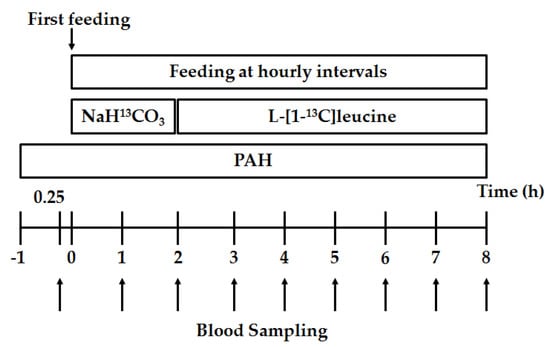 Outline of the tracer infusion and blood sampling protocols. After 15 min of blood sampling at baseline, pigs were fed at hourly intervals with intravenous infusion of NaH13CO3 for 2 h followed by a 6-h infusion of [1-13C]leucine. Blood samples were obtained every 1 h throughout the 8-h tracer infusion. One hour before the first feeding, an infusion of p-amino hippurate (PAH) was made and continued throughout the experimental period.