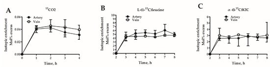 Time course of isotopic enrichment of: 13CO2 (A); [1-13C]leucine (B); and [1-13C]KIC (C) in carotid artery and femoral vein during intravenous infusion of NaH13CO3 and [1-13C]leucine (Experiment 2). Duration of NaH13CO3 infusion was 0–2 h with steady state reached between 1 and 2 h. Duration of [1-13C]leucine infusion was 2–8 h with steady state reached between 5 and 8 h for both [1-13C]leucine and [1-13C]KIC. Enrichment is expressed as mole percent excess. Values are means ± SEM (n = 3 pigs/group).
