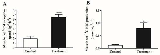 Muscle net [1-13C]leucine uptake (A); and [1-13C]KIC production (B) in piglets fed reduced-protein diets without (Control) or with (Treatment) supplemental branched-chain amino acids in the fed state (Experiment 2). Values are means ± SEM (n = 6 pigs/group). * p < 0.05 versus control group. *** p < 0.001 versus control group.
