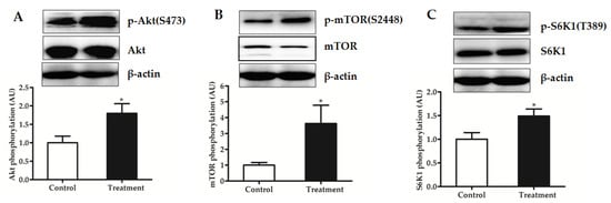 Phosphorylation of: Akt at Ser473 (A); mTOR at Ser2448 (B); and S6K1 at Thr389 (C) of longissimus dorsi muscle in piglets fed reduced-protein diets without (Control) or with (Treatment) supplemental branched-chain amino acids in the fasted state (Experiment 1). Relative total protein was used as an internal standard for normalization. Data are means ±SEM (n = 6 pigs/group). * p < 0.05 versus control group.